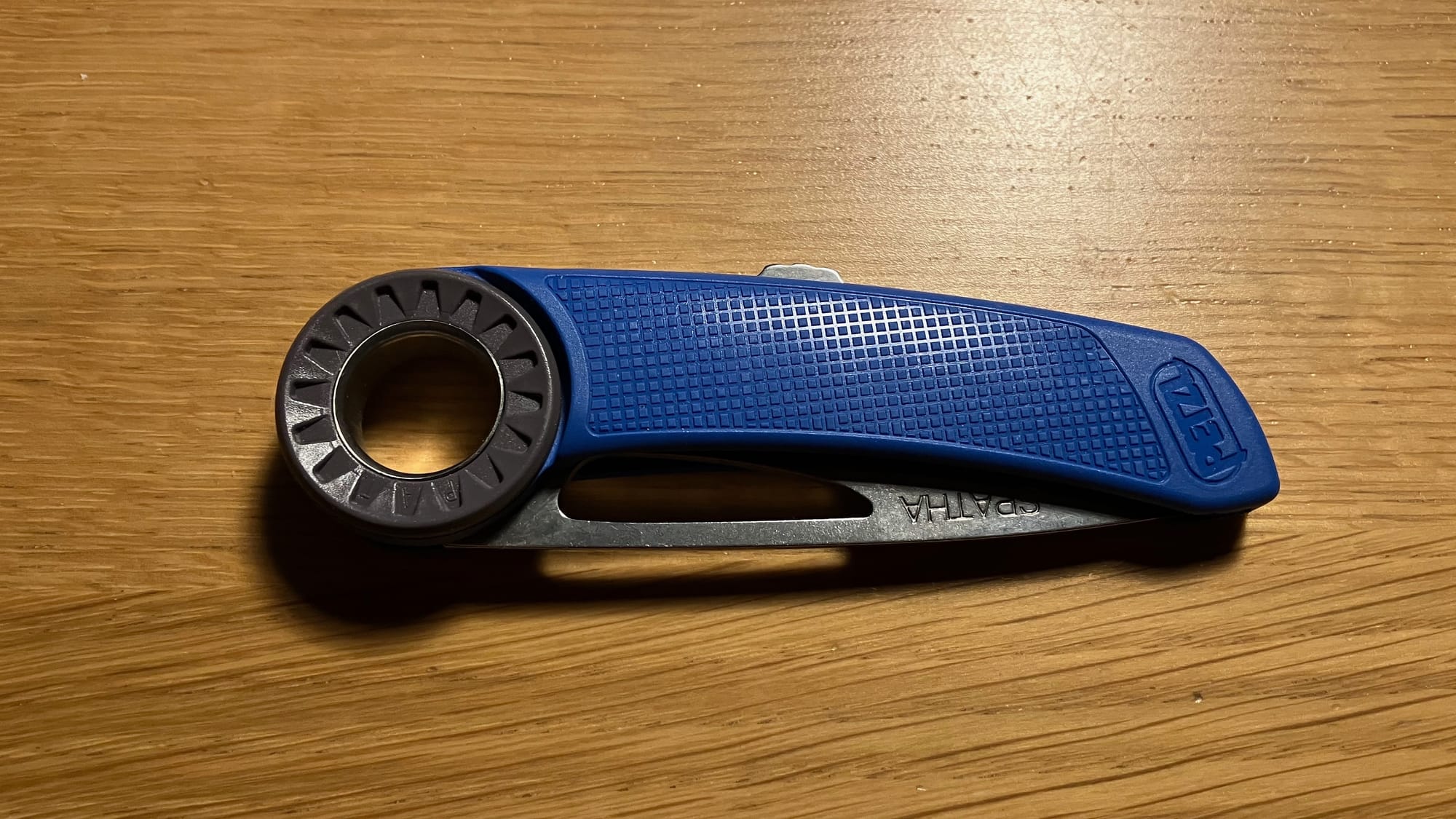 Petzl Spatha är en fällkniv med lås så att den inte fälls ihop av misstag. Eggen är sågtandad närmast handtaget och rak längst fram. Kniven är nog främst tänkt för klättring och det är möjligt att sätta en karbinhake i hålet i mitten.